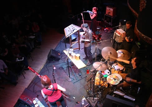 DAMON: The songs from the period when Nicci was in the band -New American Gothic, All Last Night, Disaster, Analemma, Last of the Blue Bloods, Ultima Thule - are spread over the first three albums, most of them arranged for the quintet, with Nicci’s original parts preserved. I don’t think I imagined we’d become a rock band at the outset, though the “avant” part was arguably always there - I’d been frustrated in the past trying to realize my more elaborate ideas with rock musicians, so I didn’t dare dream too big, thought we’d keep it simple and if it picked up steam and became something else, great. We’d been talking about trying to find a bassoon player to fill the gaping low-end hole in our chamber-folk ensemble, but then Jason materialized at the same time as Kate and suddenly we had both bassoon and bass. For Jordan not to play kit with Jason in the band would have been ridiculous. They have been an unstoppable drums-bass unit in many ensembles (including their current trio with Fred Frith). I'm frequently blown away by the things that spontaneously happen between them: Kate started referring to them collectively as Jorston Gloops to honor this eerie synchrony. I was thrilled to be able to become a band with a full-fledged, organic rhythm section. For a while I had the silly idea that "Serious" music was what I should be doing as a "composer," and that I'd grow out of my childish habit of writing songs. And now I reject that whole way of thinking... I composed All My Friends Are Dead, Saturday Afternoon on the Median, First of the Year, and a bunch of other things right away and never wrote another non-band piece of music unless I was asked to.
